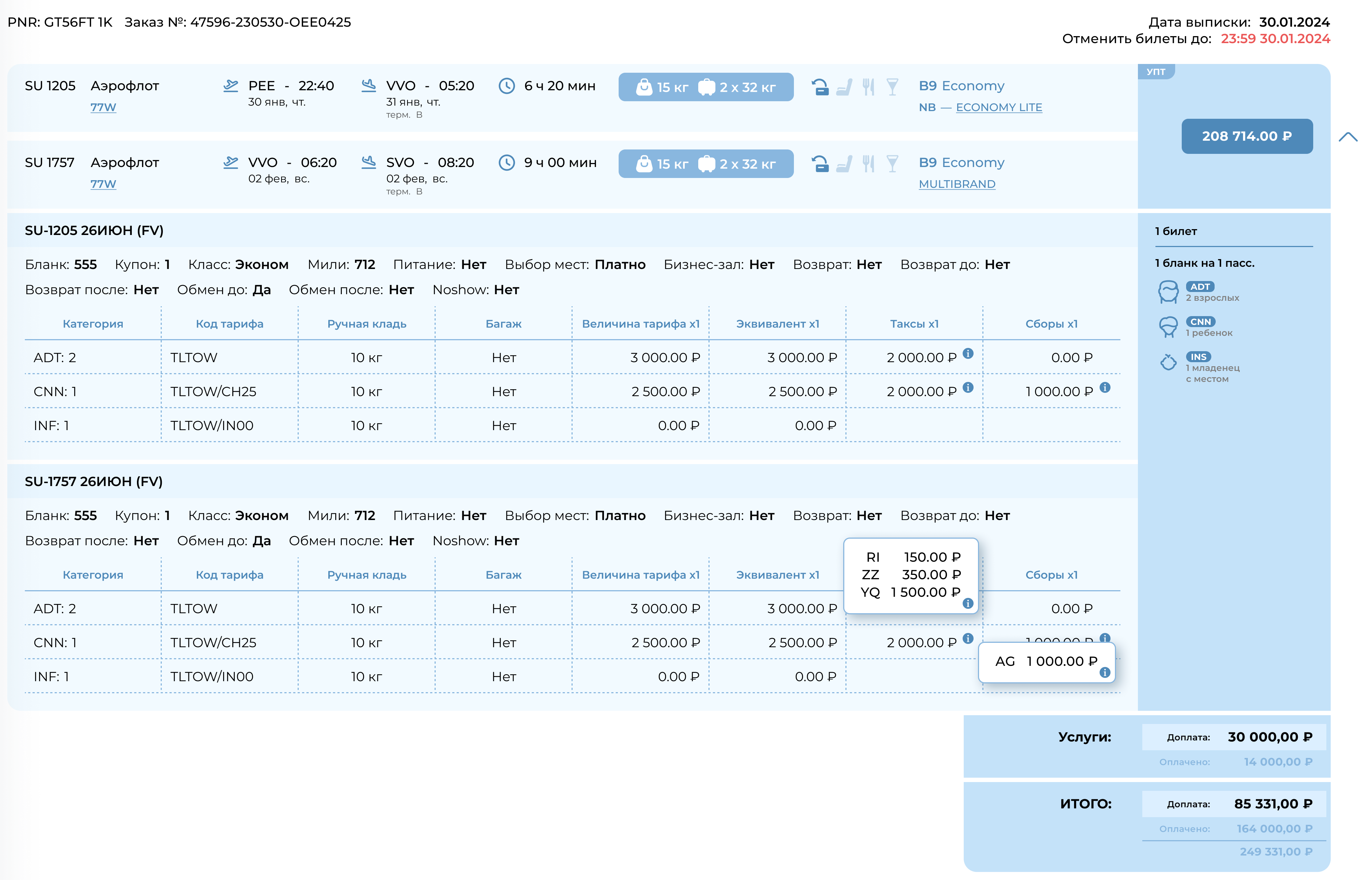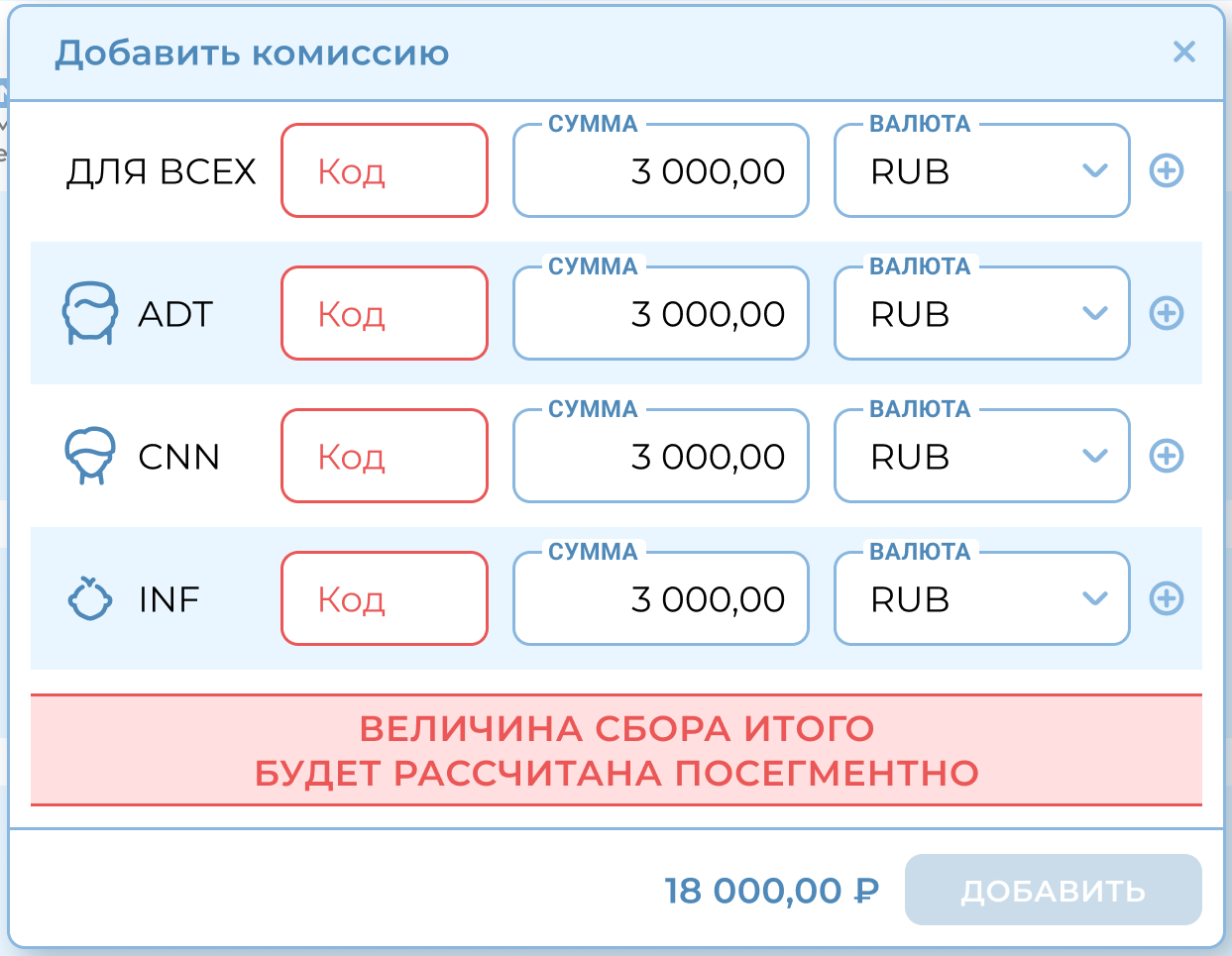 Если комиссии добавлены и для всех пассажиров, и для отдельной категории, то пассажирам выбранной категории будет добавлено две комиссии: которая была выбрана для всех, а также которая указана для данной категории.