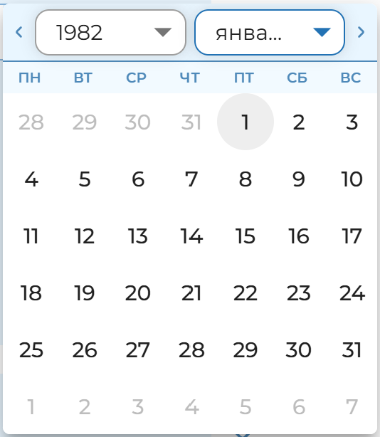 Дата рождения — обязательное поле, заполняется текстом, с возможностью выбрать в календаре, формат внутри поля - 8 цифр: ДД.ММ.ГГГГ, введение года рождения полностью - обязательно. Разделители проставляются автоматически. Для интерактивного управления значением даты рождения доступен календарь. Поля месяц и год в календаре выполнены в виде выпадающего списка с возможностью выбрать месяц и год отдельно. После выбора года и месяца пользователь выбирает день нажатием даты в открывшемся календаре.