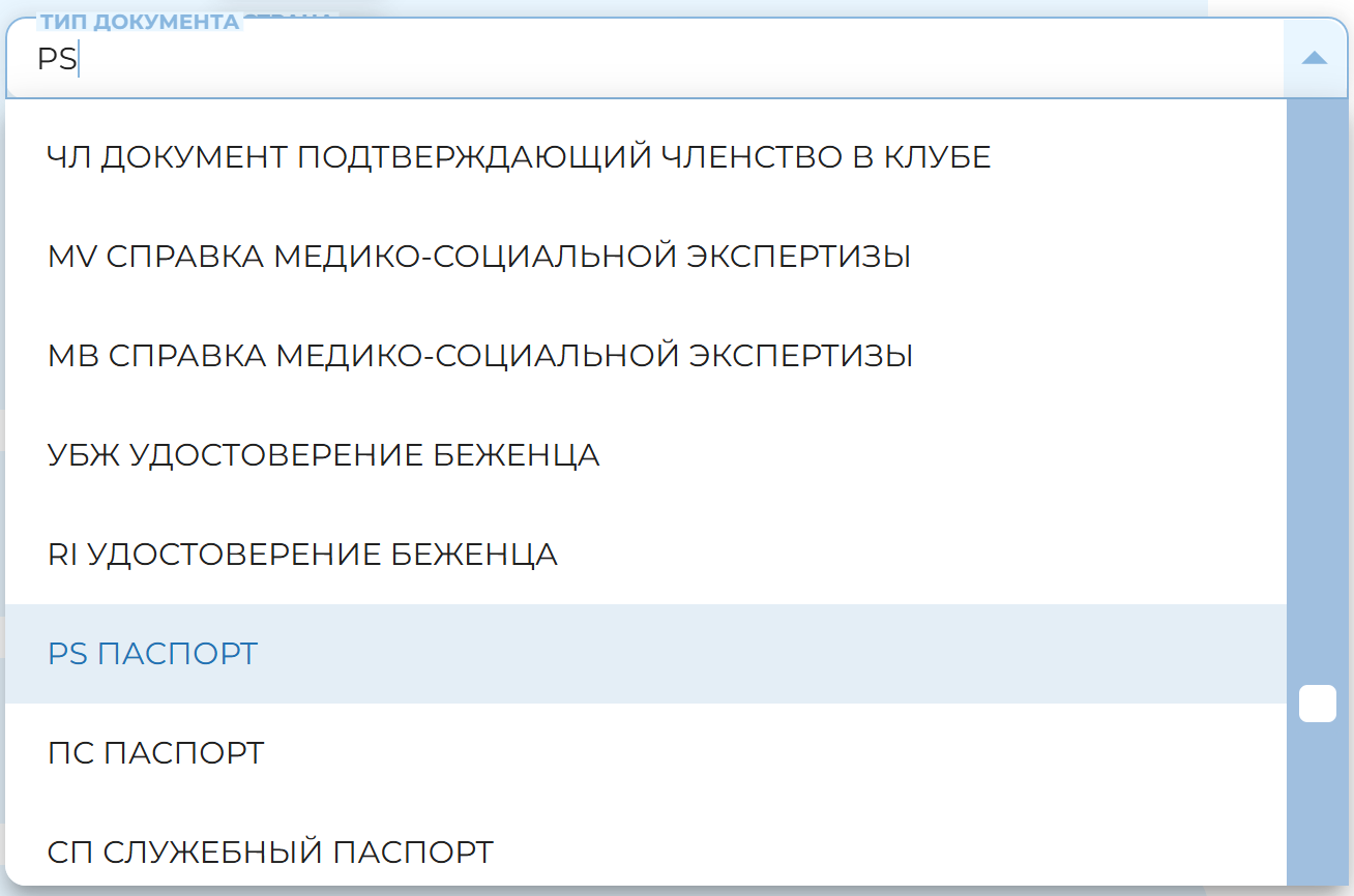 По умолчанию тип документа пассажира PS (Паспорт) у взрослого пассажира и SR (Свидетельство о рождении) у пассажиров категорий: UNN, CNN, INF, INS. Если документ с типом SR выдан в иностранном государстве, то необходимо выбрать соответствующий код страны. При вводе номера документа типа SR не используются пробелы и знаки «-».