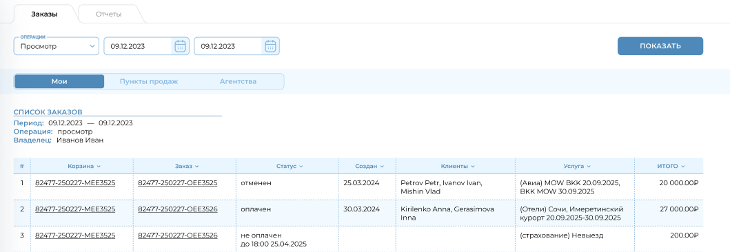 - Клиенты - список ФИО пассажиров в заказе;
