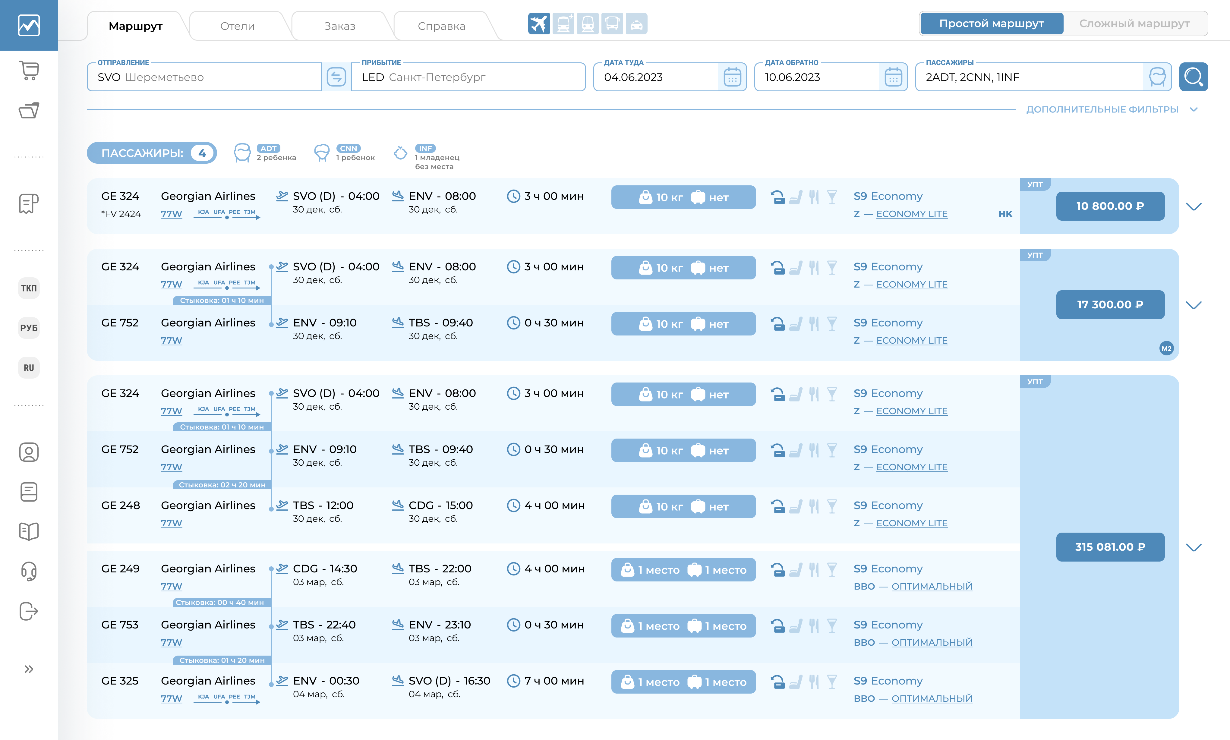 Простой маршрут предполагает поиск одного направления, только туда или туда-обратно. Поиск возможен при заполнении четырех обязательных полей. Дополнительные параметры поиска вынесены в отдельные поля и заполняются опционально. Благодаря им поиск можно сделать более точным с учетом запросов конкретного клиента.