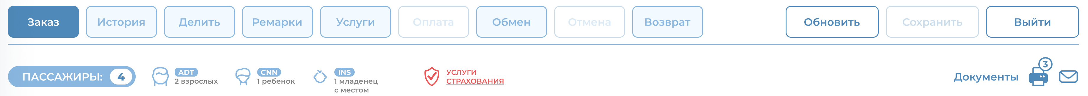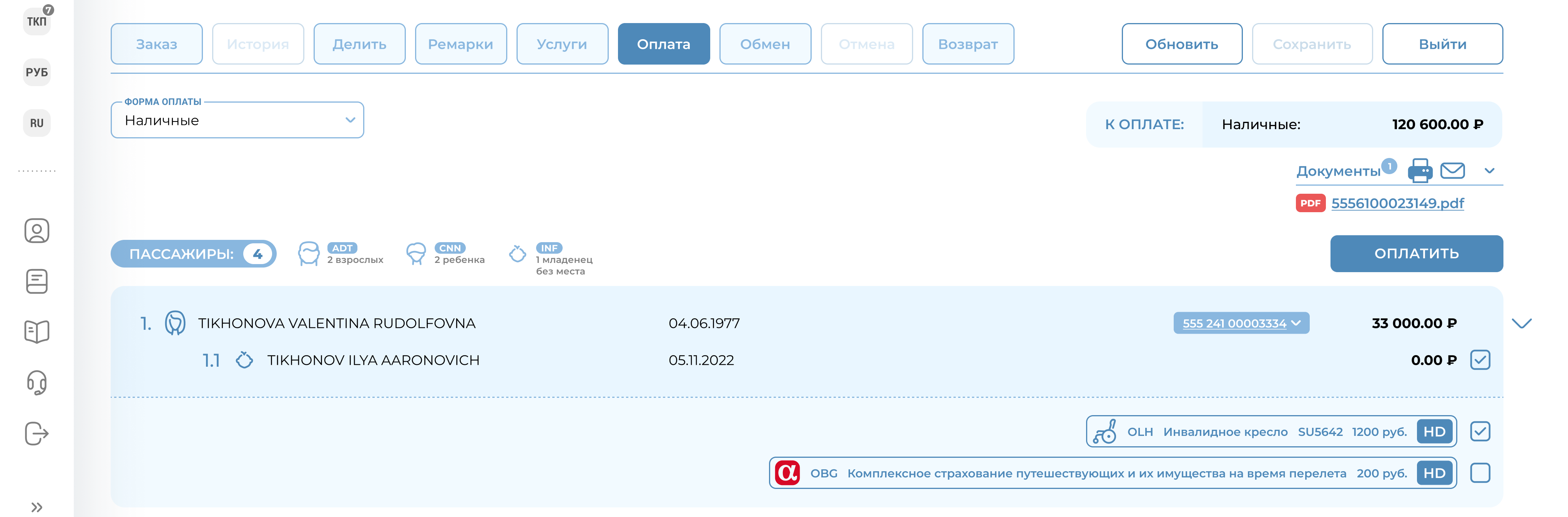 3) Данные пассажира без места, как и при просмотре заказа (раздел «Заказ» на панели управления заказом), отражены в блоке взрослого пассажира, к которому ассоциирован пассажир без места.