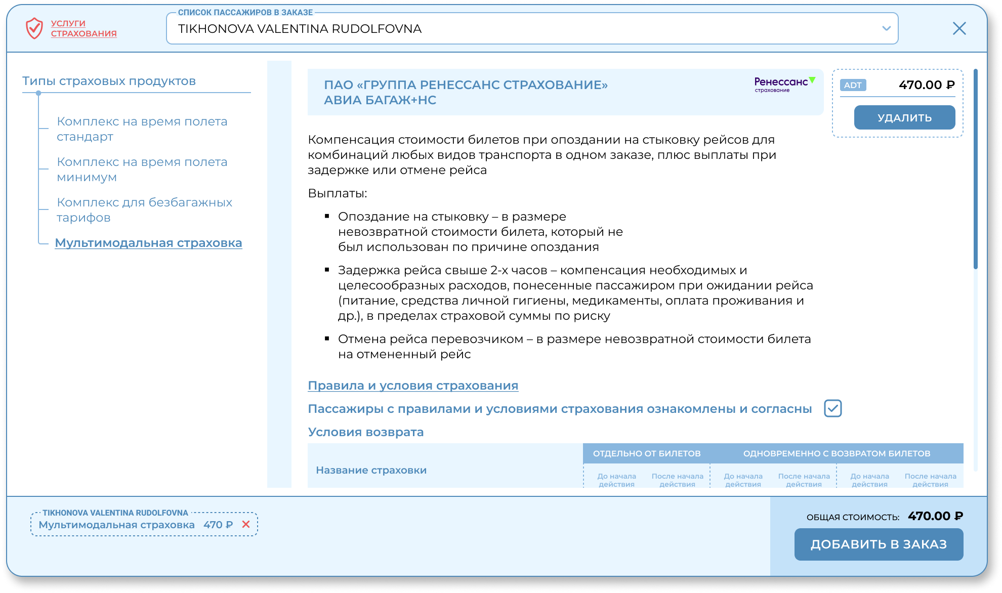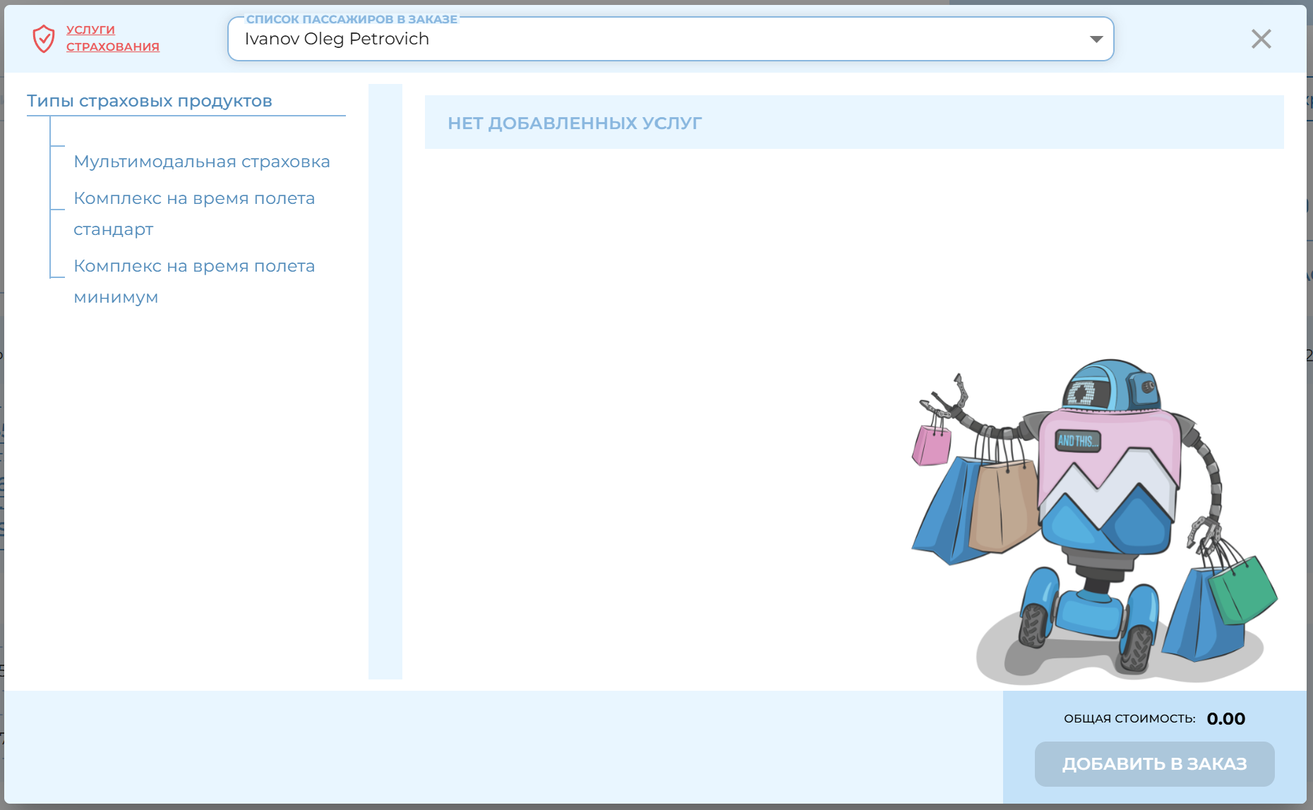 Для добавления услуги страхования в заказ пользователю необходимо отметить согласие «Пассажиры с правилами и условиями страхования ознакомлены и согласны». И нажать кнопку «Добавить». Добавленная услуга появится в корзине поп-ап услуг страхования. При необходимости услугу можно удалить напрямую из поп-ап корзины. Для добавления услуг в заказ пользователю необходимо нажать кнопку «Добавить в заказ»