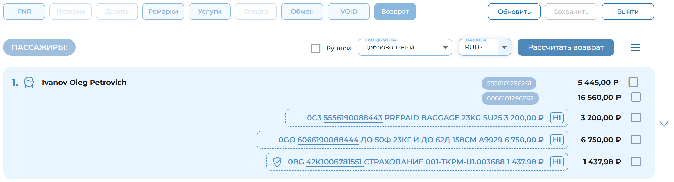 На панели управления заказом при нажатии кнопки «Возврат» у пользователя есть возможность выбрать какую часть заказа необходимо вернуть. Необходимо выбрать услугу страхования к возврату. После выбора услуги страхования активируется кнопка «Рассчитать возврат». После расчета возврата пользователю будет отображена сумма возврата с отрицательным значением. Нажатием кнопки «Возврат» пользователь проводит операцию возврата услуги страхования.