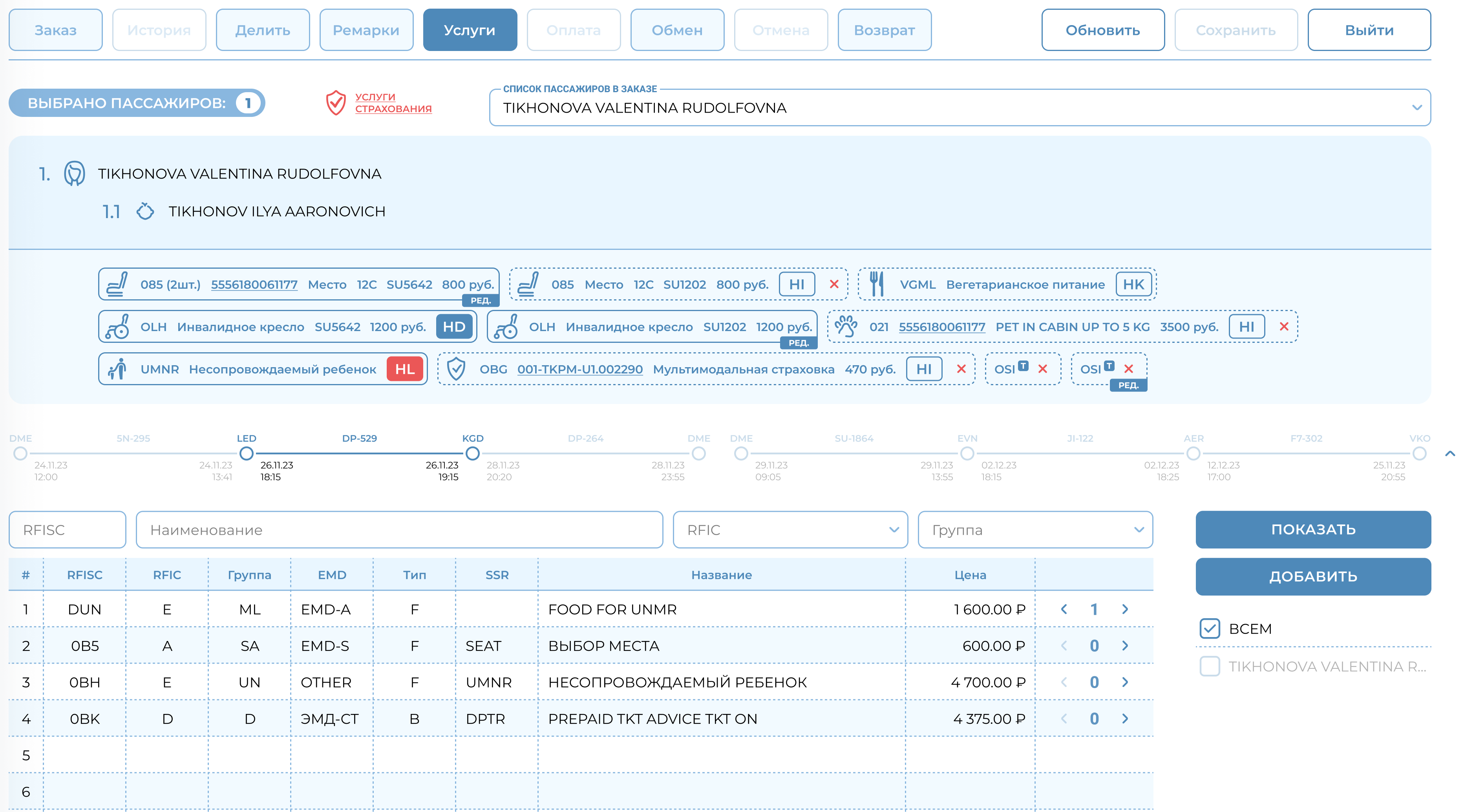 Статусы добавленных услуг будут отражены в блоке пассажира в информации об услугах на страницах: Услуги, Ремарки, Оплата.