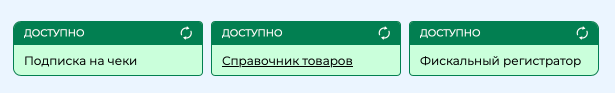 фискальный регистратор - отображает связь с ККМ, состояния доступно/недоступно/сбой, обновить связь с ККМ можно нажатием на кружок. Статус отображается вверху, также окрашен соответствующим цветом, в зависимости от статуса.