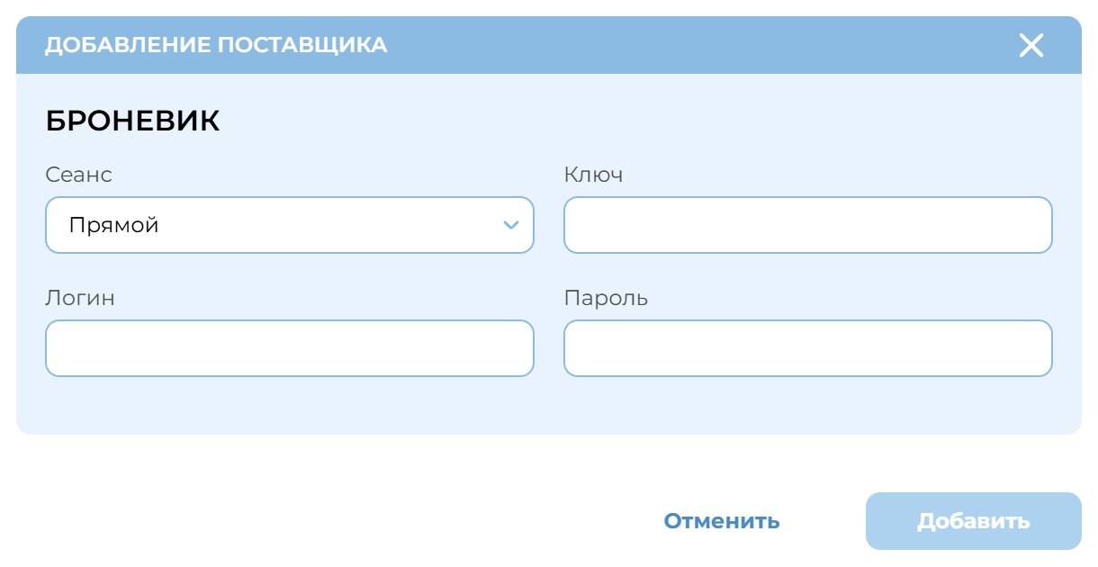 Для подключения Поставщика, Агенту необходимо выбрать в разделе «Список Поставщиков» соответствующую карточку Поставщика и нажать на нее. При нажатии откроется окно с вводом данных для авторизации выбранного Поставщика (Рисунок 3).