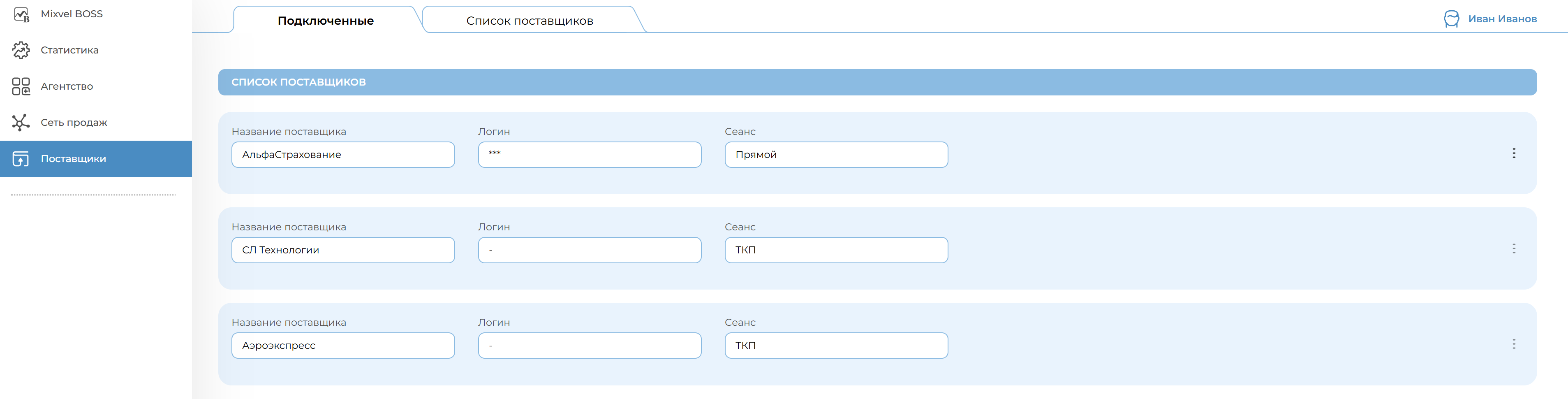 Список Поставщиков имеет как интерактивные карточки, с которыми Агент может взаимодействовать, так и обычные карточки, которые означают что данный Поставщик не требует взаимодействия с Агентом, такие Поставщики подключены по умолчанию (Рисунок 2). Интерактивные карточки подсвечиваются при наведении курсора.