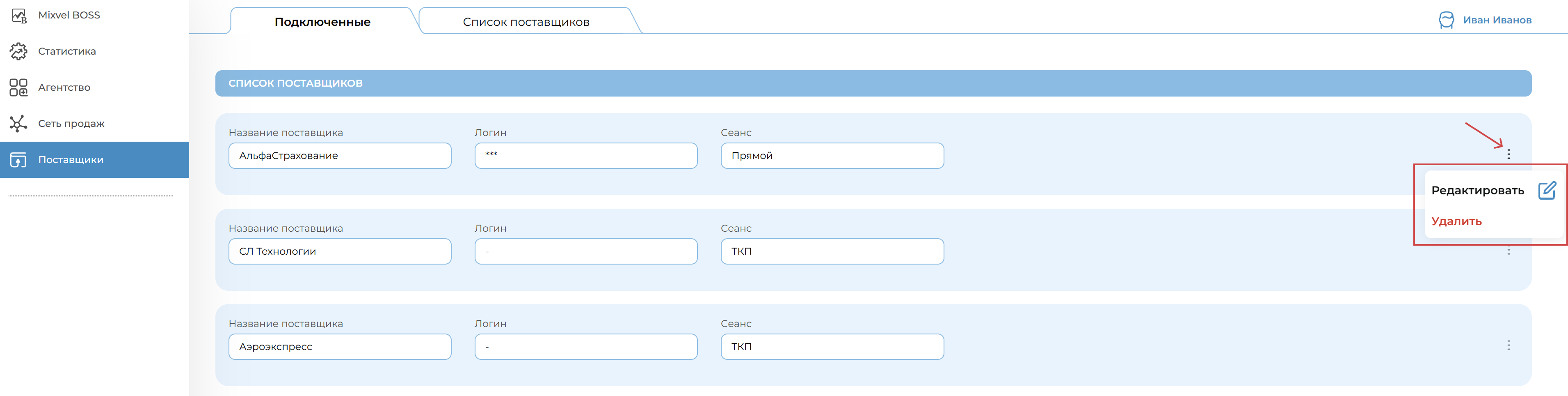Со всеми Поставщиками прямых сеансов в разделе «Подключенные» возможно выполнять действия через контекстное меню (три точки) такие действия как «Редактировать» и «Удалить» (Рисунок 6).