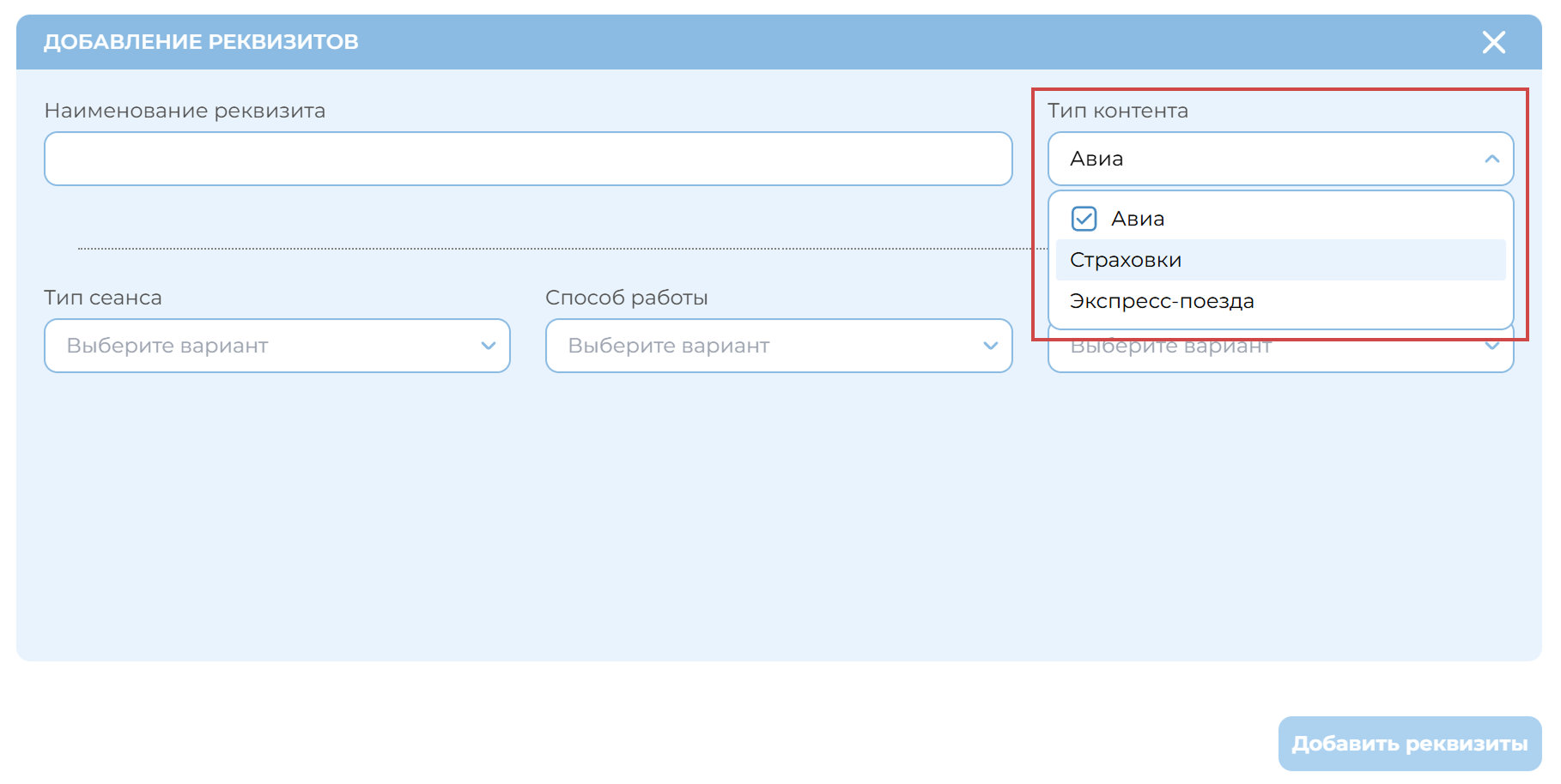 При заведении реквизита необходимо выбрать в форме «Добавление реквизитов» Тип контента, отличный от Авиа, и соответствующий подключаемому контенту (Рисунок 7).