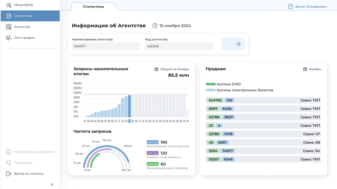 Пользователю доступна общая информация об общих продажах по Агентству, частота запросов (RPS), запросы накопительным итогом по Агентству (Рисунок 1).