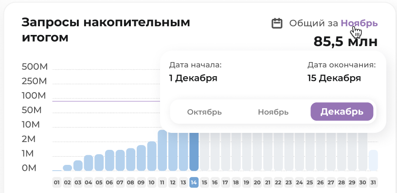 общее число запросов с распределением по шкале: 0–1 млн., 1–2 млн., 2–10 млн., 10–50 млн., 50–100 млн., 100–200 млн., 200–500 млн. запросов на графике по месяцу с накопительным итогом по состоянию на предыдущую дату;