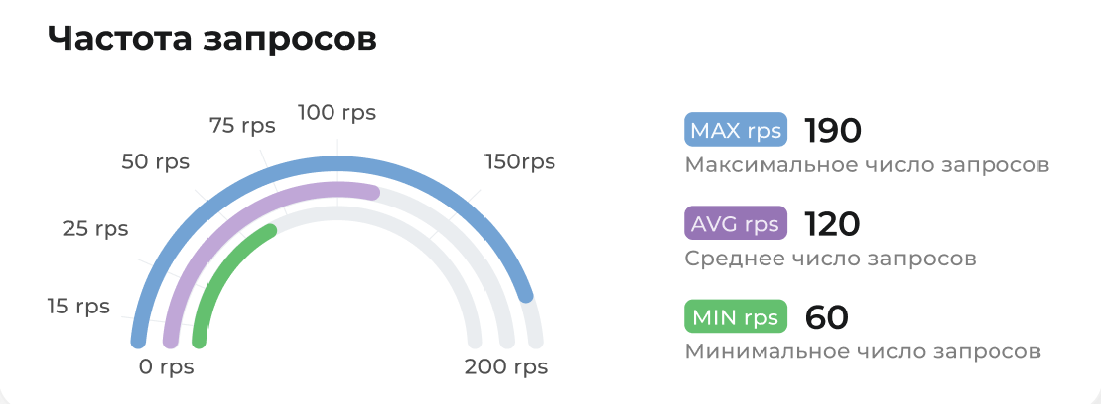 метрики MAX, AVG, MIN rps (число запросов в секунду) в диапазоне от 0 до 200 rps с разделением тарифов по договору;