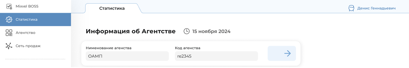 В разделе «Статистика» указывается краткая информация об Агентстве: наименование и код. Также возможно перейти в раздел «Агентство», при нажатии на стрелку справа (Рисунок 5).